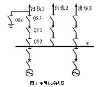 1. 單母線系統(tǒng)接線(1)只有一組母線的接線,進(jìn)出線并接在這組母線上。單母線系統(tǒng)接線圖見圖1。圖中倒閘操作:如對(duì)饋線LI送電時(shí),須先合上隔離開關(guān)QS2和QS3,再投人斷路器QF2;如欲停止對(duì)其供電,須先斷開QF2,然后再斷開QS3和QS2。即隔離開關(guān)相對(duì)于斷路器而言要“先通后斷”,母線隔離開關(guān)相對(duì)于線路隔離開關(guān)也要“先通后斷”。接地開關(guān)QS4是在檢修電路和設(shè)備時(shí)合上,取代安全接地線的作用。