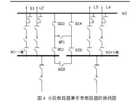 單母線系統(tǒng)分段帶旁路母線接線:為節(jié)約建設投資。常以分段斷路器兼作旁路斷路器的接線。兩段母線均可帶旁路母線,正常時旁路母線W2不帶電,分段斷路器QF1及隔離開關QS1、QS2在閉合狀態(tài),QS3、QS4、QS5均斷開,以單母線系統(tǒng)分段方式運行,見圖4。